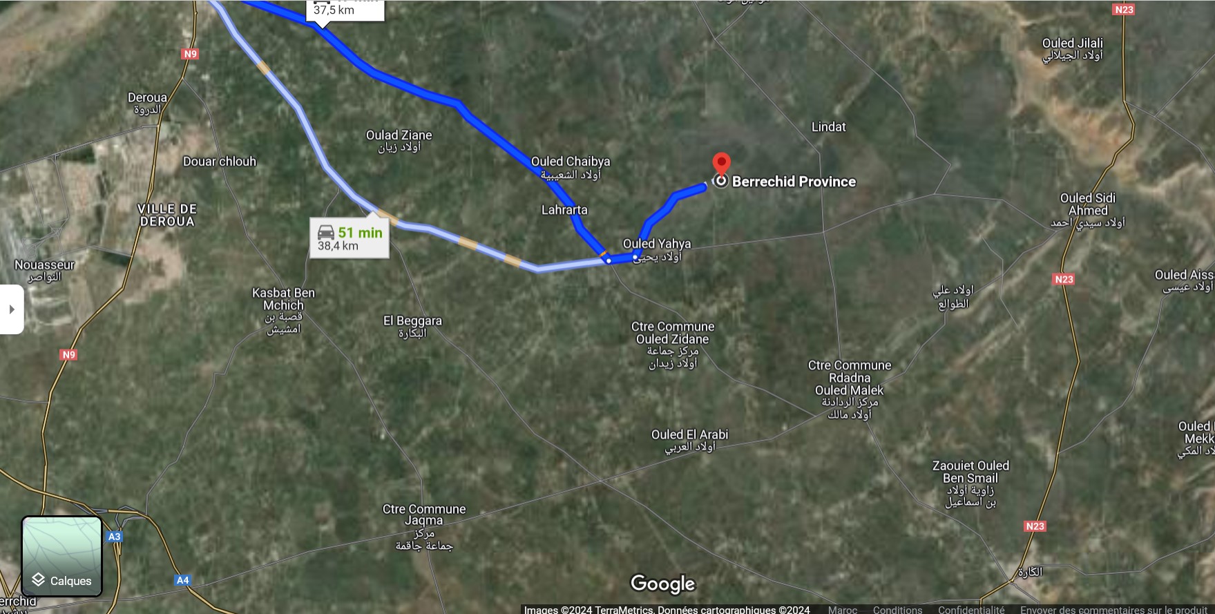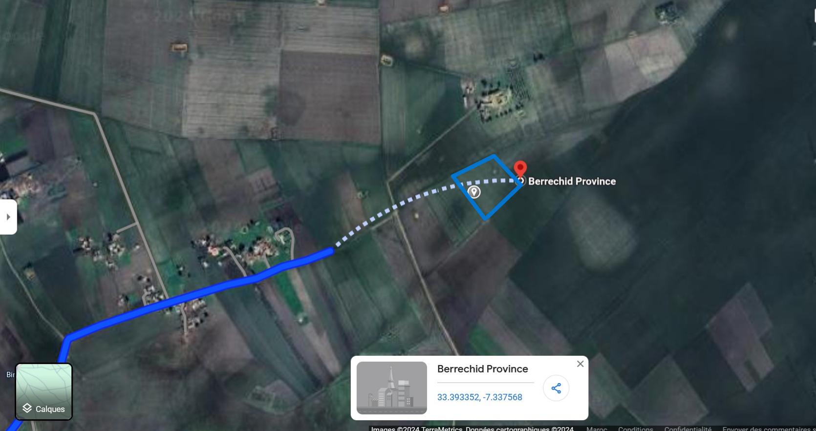 Le Terrain est à 49mn (39km) de Casablanca en passant par Mediouna par la route 3034, et à 52mn (42km) en passant par la route 3305 traversant la Commune Moualine el Ouad.